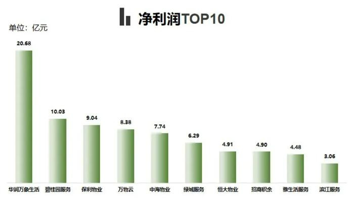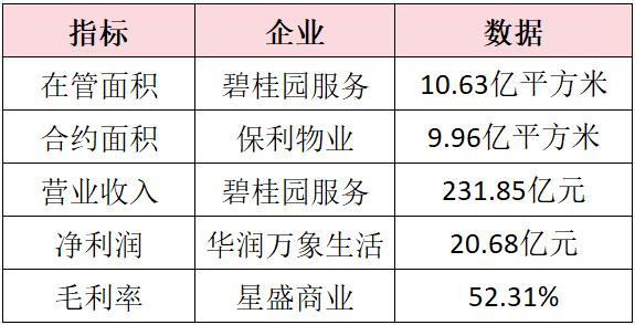 从在管面积来看,碧桂园服务在管面积最高,为10.63亿平方米,堪称“规模之王”;从合约面积看,保利物业排名第一,合约面积达9.96亿平方米;而营业收入居榜首的是碧桂园服务,达231.85亿元;净利润居首位的企业为华润万象生活,高达20.68亿元,成为最会“赚钱”的物企。