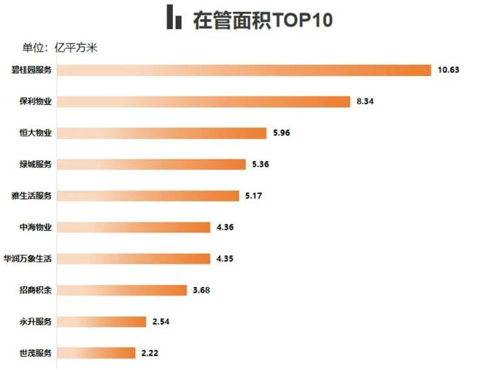 从在管面积来看,排名前三的为碧桂园服务、保利物业和恒大物业,在管面积分别为10.63亿平方米、8.34亿平方米、5.96亿平方米。